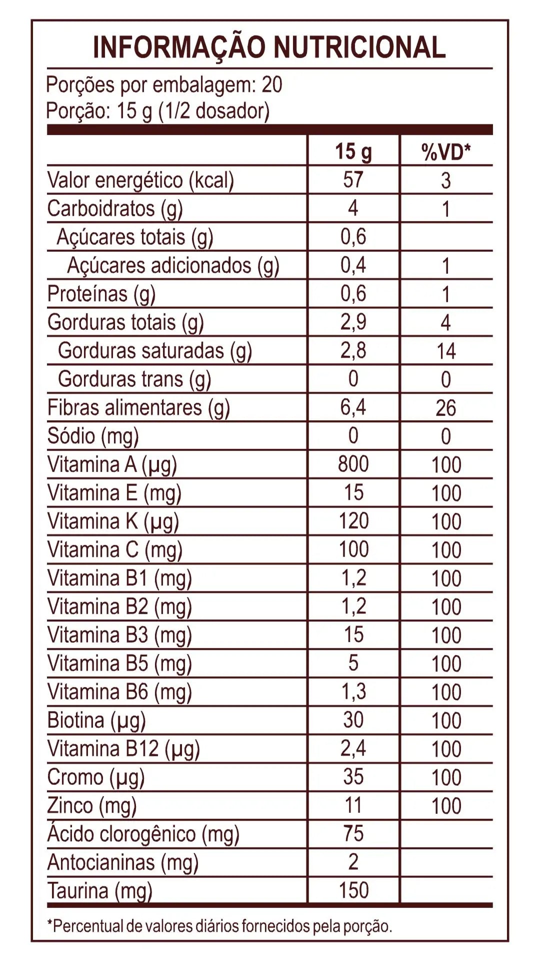 Goma acácia, leite de coco desidratado em pó, goma guar, suco de morango desidratado em pó, triglicerídeos de cadeia média (TCM), inulina, psyllium, laranja vermelha, café verde em pó, taurina, ácido ascórbico, bisglicinato de zinco, acetato de tocoferol, nicotinamida, menaquinona-7, pantotenato de cálcio, cloridrato de piridoxina, tiamina, riboflavina, acetato de retinol, biotina, picolinato de cromo, cianocobalamina, aromatizante, edulcorante glicosídeos de esteviol (stevia) e corante natural de beterraba e cenoura.